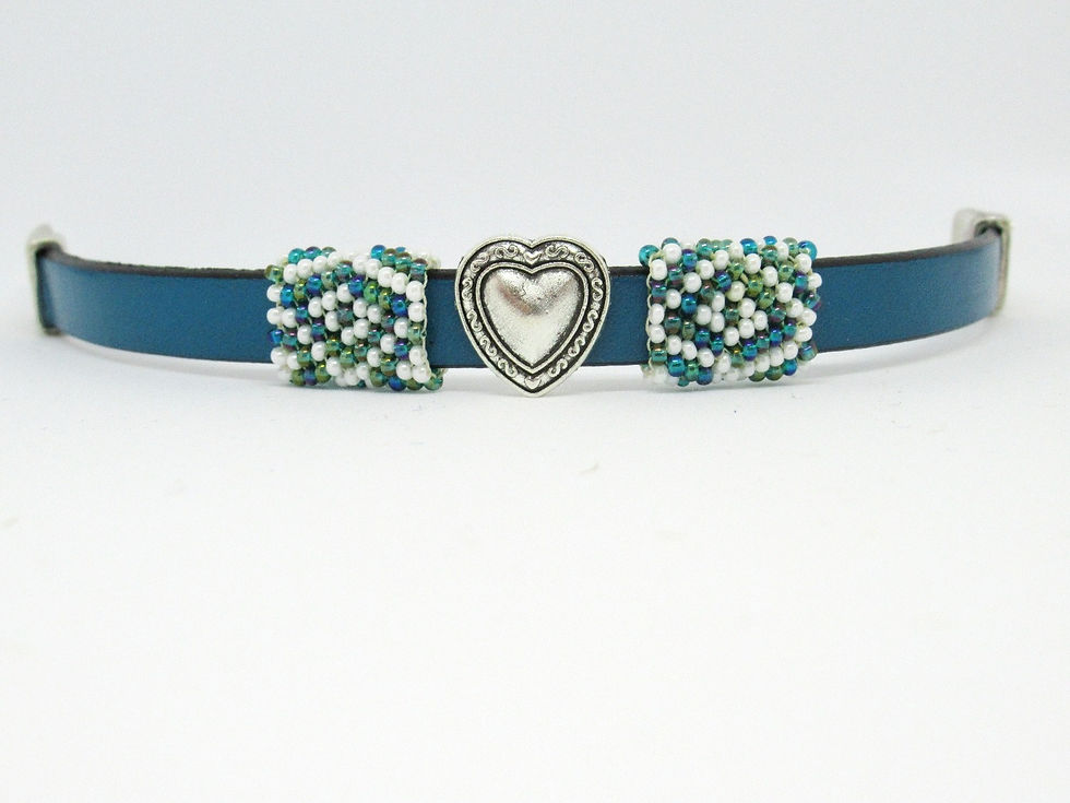Turquoise flat band leather bracelet with hand beaded turquoise-white sleeves